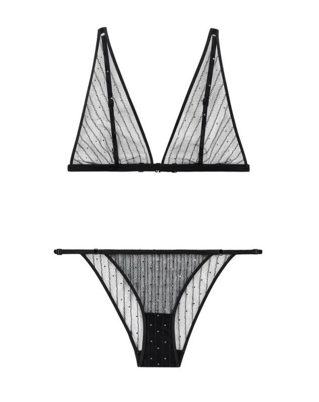 La boîte à désir Nuit Étoilée de la marque Aubade vous propose une sublime bralette triangle et une culotte mini-coeur, ces deux produits sont composés d’une laize brodée ornée de petits strass brillants qui viennent faire scintiller cet ensemble.