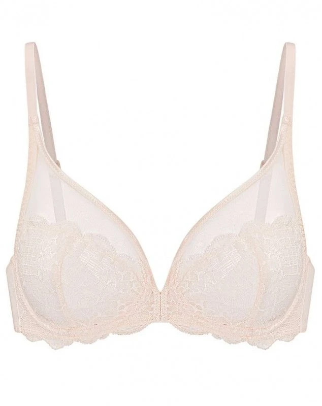 Le soutien-gorge à armatures au décolleté plongeant Rêve de Simone Pérèle est orné de sa dentelle de fleur sur les bonnets qui vient embellir la poitrine de par son décolleté prononcé.