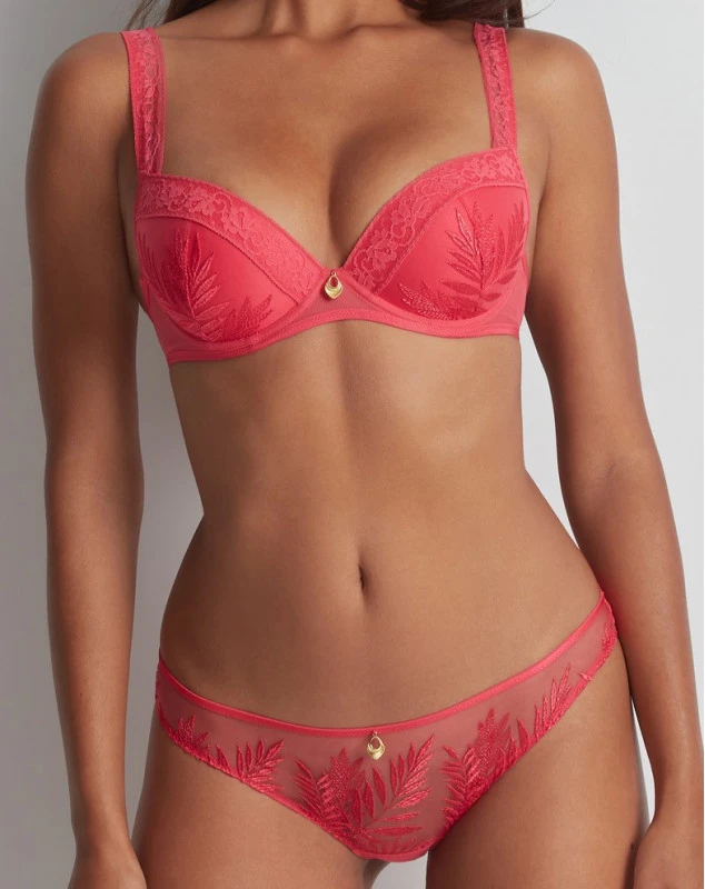 La collection Parenthèse Tropicale de Aubade propose des produits modernes, quotidiens et sexy. Elle est le résultat d’une broderie végétale et d’une bande de dentelle Leavers florale à l’écaille droite. Des jeux de transparence donnent un côté sensuel.