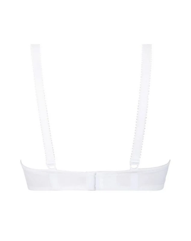 Le soutien-gorge sans armature bien-être Stricto Sensuelle de la marque Antigel a une forme souple et confortable. Ce modèle possède des bonnets et basques en dentelle, un dos en maille, un bijou à l’entregorge et des bretelles fantaisies.